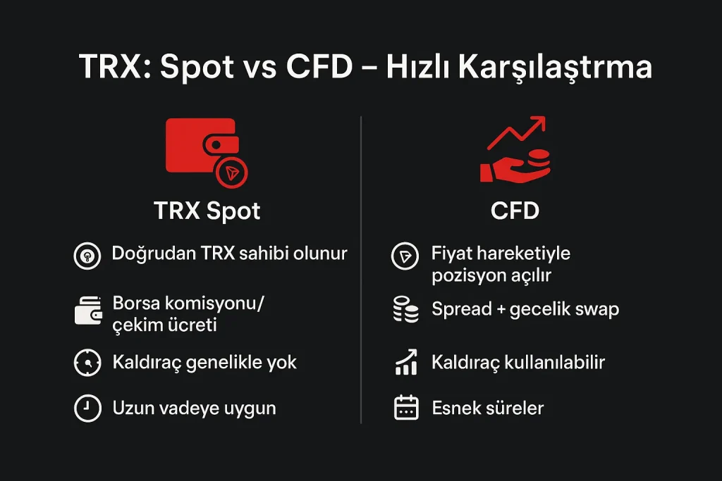 Spot işlemlerde TRX’i alır ve cüzdanda tutarsınız; CFD’lerde dayanak varlığa sahip olmadan fiyat hareketine pozisyon alırsınız. Hızlı karşılaştırma: